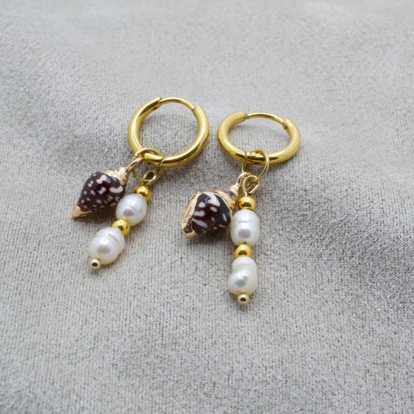 Goud rvs oorrringetjes met zoetwaterparel en schelp bedel