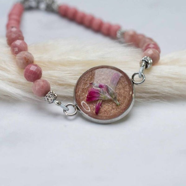 Zilver rvs ketting met bedel van droogbloem in epoxy